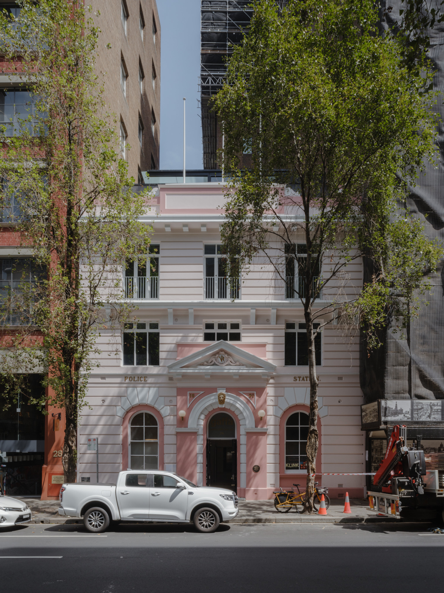 (below: view from Druitt St, Hamish McIntosh). Nestled amongst office and commercial buildings at the southern end of Clarence St, the building is substantially lower than its neighbours. The works involved facade restoration and repainting, a key concern of which was the desire to make people notice this little but significant piece of Sydney's history. Prior to the renovations, painted an orange/ochre colour, the building had garnered the informal nickname of "the Pink Police Station" - a moniker we felt worthy and a playful way to highlight this piece of the city.